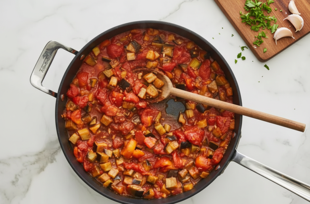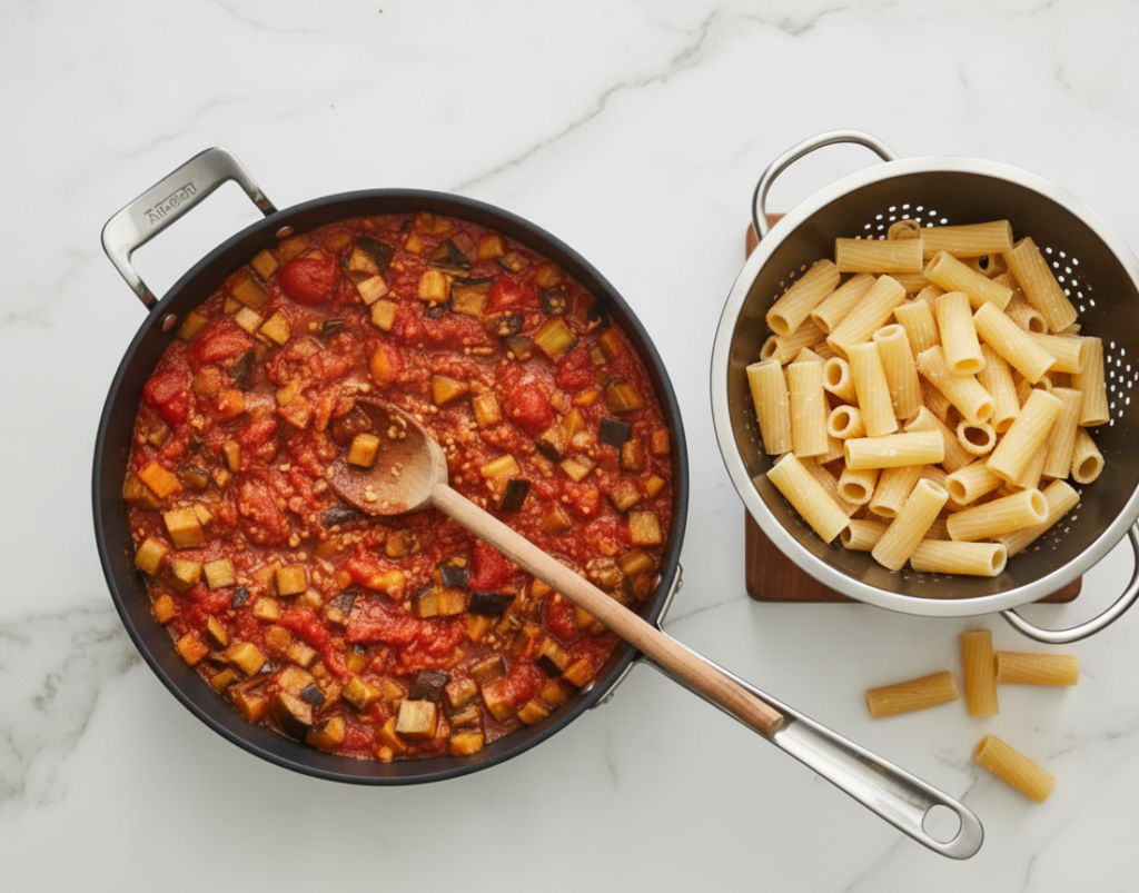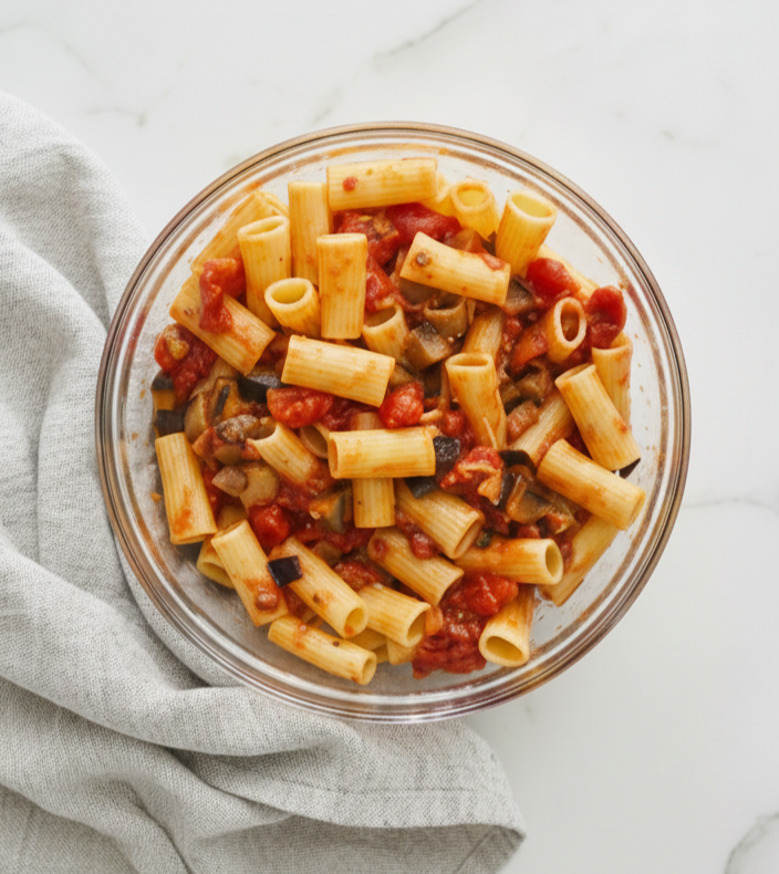 The finished dish has a tender texture from the cooked eggplant and a slightly firm bite from the rigatoni. The tomato sauce is light yet flavorful, coating the pasta evenly. Every bite delivers a comforting combination of soft vegetables and structured pasta.