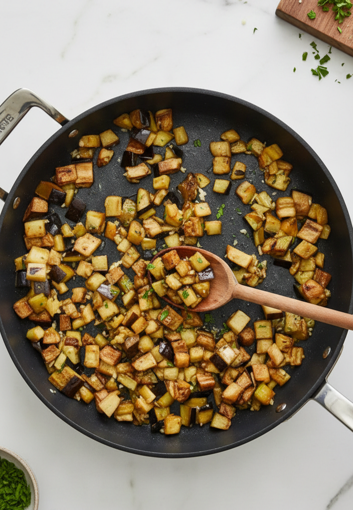 Start by heating ¼ cup of olive oil in a large skillet over medium heat. Once the oil is warm, add the minced garlic and cook, stirring constantly, for about 1 to 2 minutes. This step allows the garlic to release its aroma and infuse the oil, creating the perfect flavor base for the dish. Next, add the cubed eggplant. Stir frequently to ensure even cooking, and continue until the eggplant becomes tender and soft, which usually takes about 5 minutes.